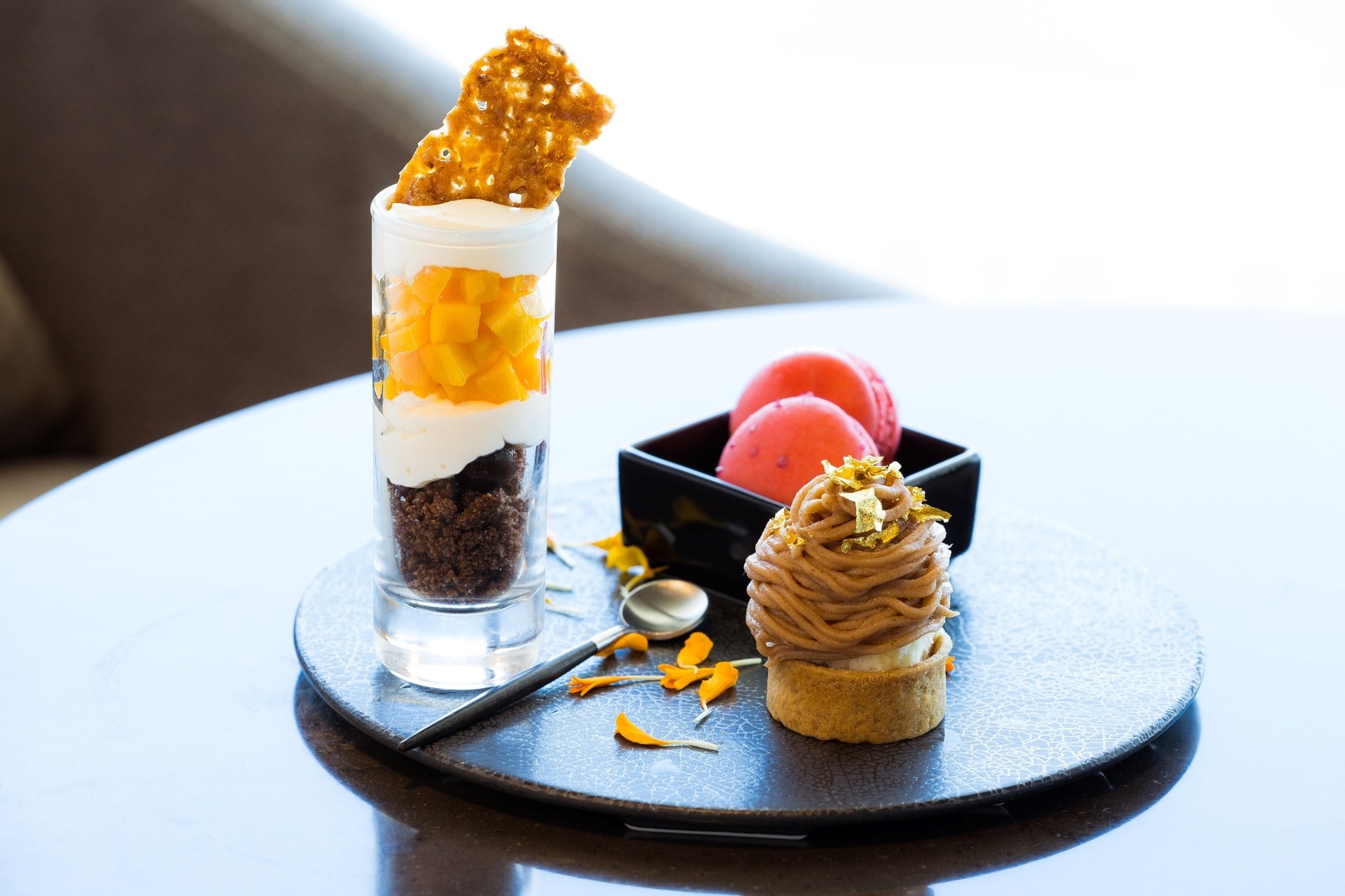 世界的に名高い兵庫県産ブランド牛「神戸ビーフ」を、ステーキハウス「オリエンタル」統括料理長・鍬先章太がアフタヌーンティー向けにアレンジをしました。セイボリーには、鶏ガラや神戸ビーフのミンチなどを丁寧に煮出し、旨味を凝縮させた「神戸ビーフのコンソメ」、肩ロースをじっくりとろとろになるまで煮込んだ「神戸ビーフシチューのパイ」、「ローストビーフサラダ」のドレッシングには、神戸市西区産の丸大豆・小麦を100%使用した天然醸造の濃口醤油「玉福」を使い、肉と野菜の味わいを最大限に引き立てています。スイーツには、シェフ特製モンブランや神戸の人気店「patisserie AKITO」と共同開発したミルクジャム付きスコーン、層ごとに食感が変化するパフェなどをラインナップ。食前のスパークリングワイン、食後の紅茶やコーヒーとともに、秋だけの美味をお楽しみいただけます。