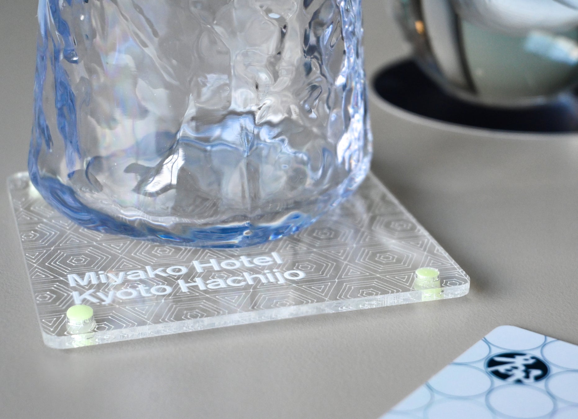 「アクリルグッズ等再生利用促進協議会」の協力で計画がスタート。予定していたリサイクル方法を見直すなどの紆余曲折を経て、CO2削減と品質維持を両立する「アップサイクル(洗浄・カット・研磨・加飾)」により、飛沫防止用アクリル板がホテルロゴ入りコースターとSDGsバッジに生まれ変わりました。コースターは客室備品として、ウォーターサーバー用カラフェと共に使用されており、京都のイラストを入れたコースターは¥800(税込)で購入することも可能です。この収益を、京都の文化や観光資源の保護に活用することで、地域環境保全に役立てることも目標のひとつです。