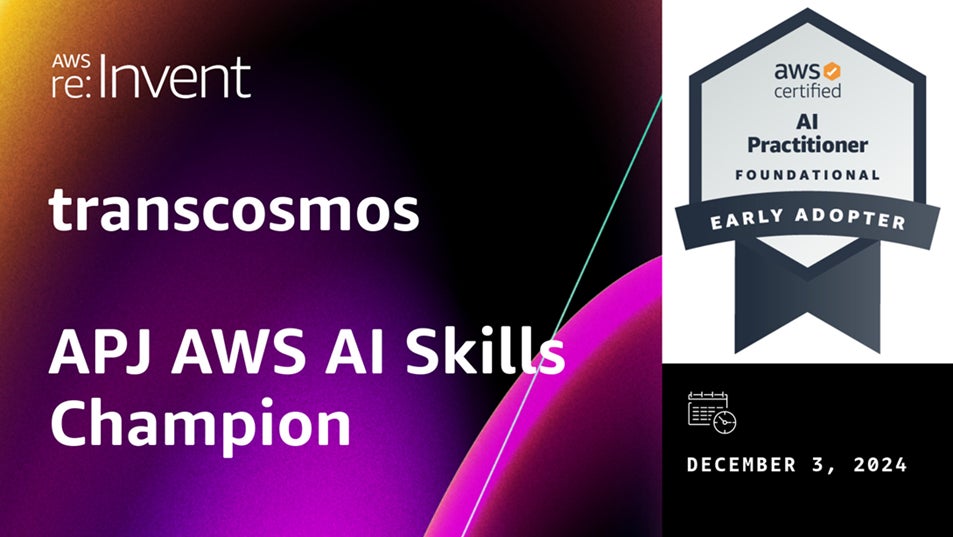 トランスコスモスおよびトランスコスモスの戦略子会社である株式会社トランスコスモス・デジタル・テクノロジーは、2024年12月2日~6日、アメリカ合衆国ネバダ州ラスベガスで開催されたAWS re: Invent 2024 (https://reinvent.awsevents.com/)において、「APJ AWS AI Skills Champion」としてアジアの企業で唯一受賞しました。