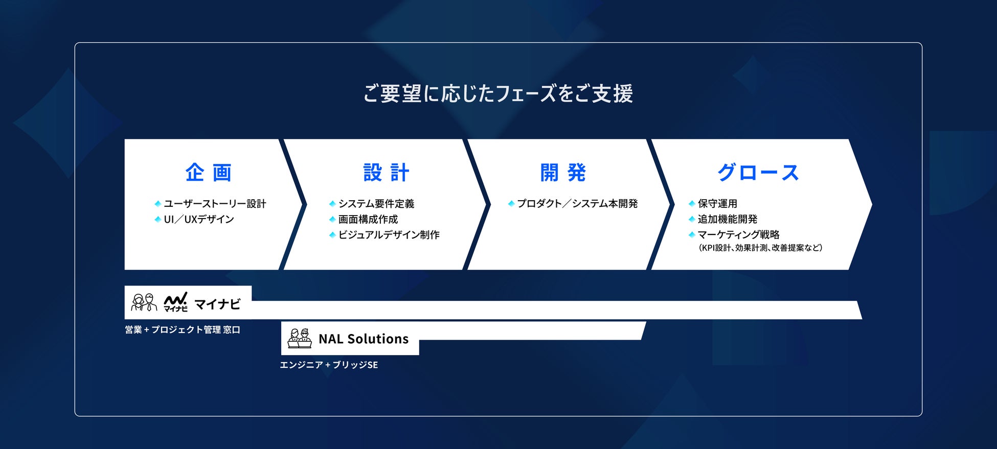 IT人材不足が加速する日本において、マイナビがNALSなどの海外拠点パートナーとともに企業のソフトウェア開発のディレクションから開発までを一貫してサポートし、サービスの構想・設計段階のコンサルティング、開発プロセスの見直し、プロジェクトリーダーの育成、優秀な人材の採用体制構築などの開発品質向上につなげます。