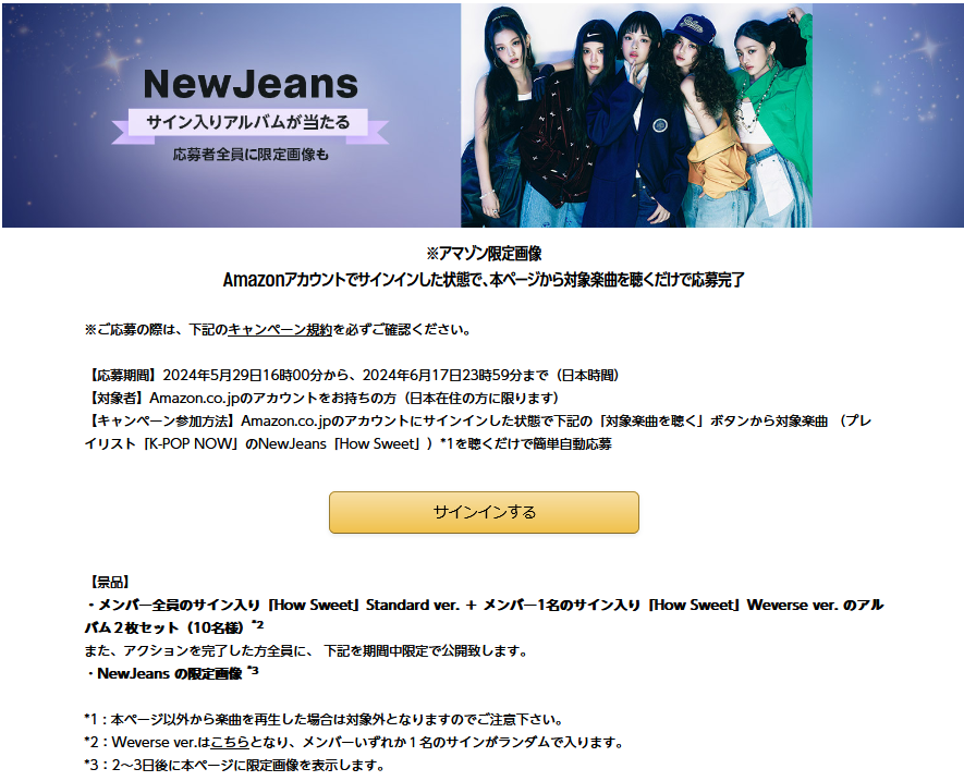 ・ ご参加いただくには、Amazon.co.jpのアカウントにサインインした状態で、キャンペーンページにアクセスいただき、対象の楽曲(新曲「How Sweet」)を聴いていただく必要がございます。Amazon Musicで対象楽曲をお聴きいただいただけでは、キャンペーンの応募対象にはなりませんのでご注意ください。