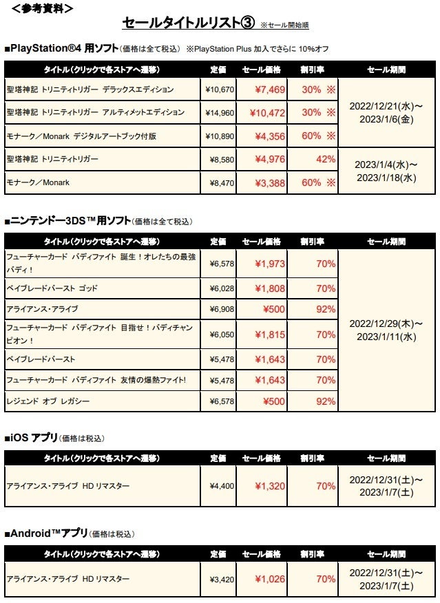 また、ニンテンドー3DS™/iOS/Android™アプリも年末年始にかけてセールを実施いたします。
