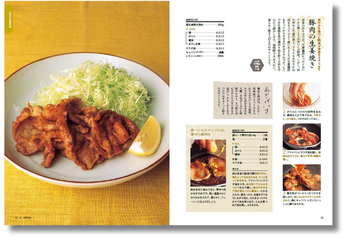 たとえば「豚肉の生姜焼き」。一般には豚肉を生姜醤油に漬け込んで焼くイメージがありますが、野﨑さんの方法は違います。豚肉は焼く前に生姜醤油にさっとからませ、焼いた後の仕上げに残りの生姜醤油を回しかける。これだけで、お肉が柔らかく、生姜の香りも生き生きとしたおいしい豚の生姜焼きが作れます!