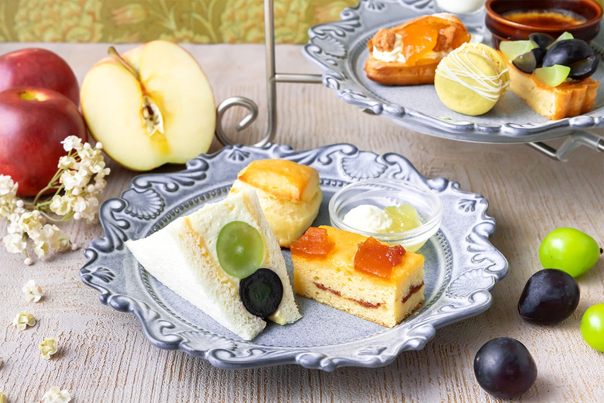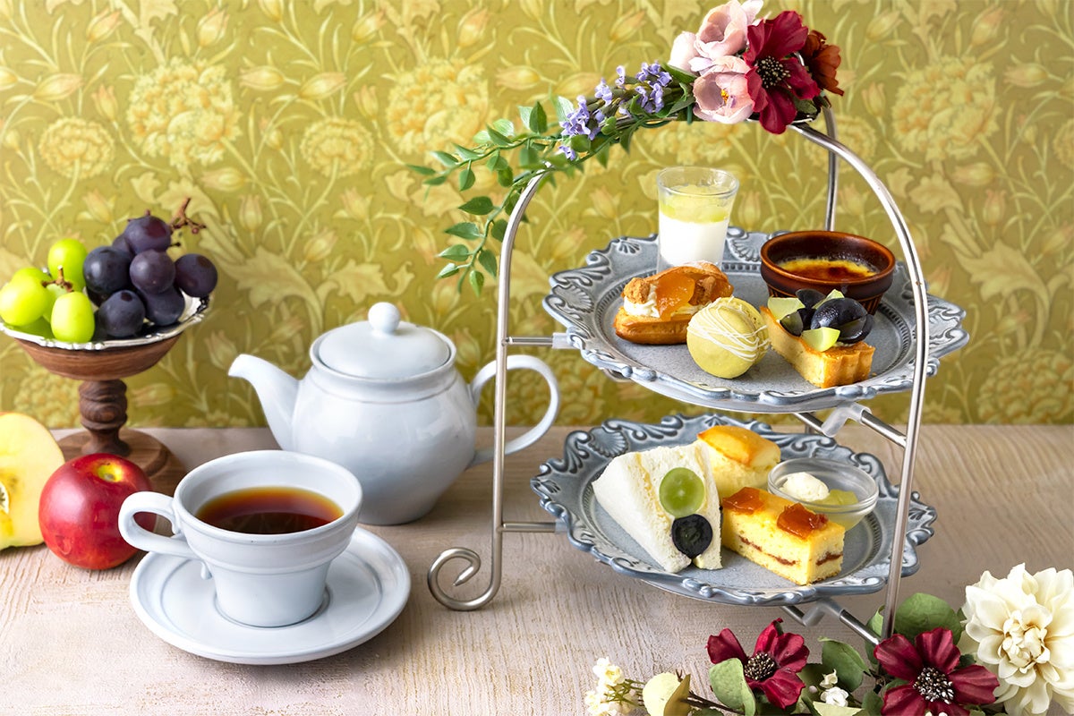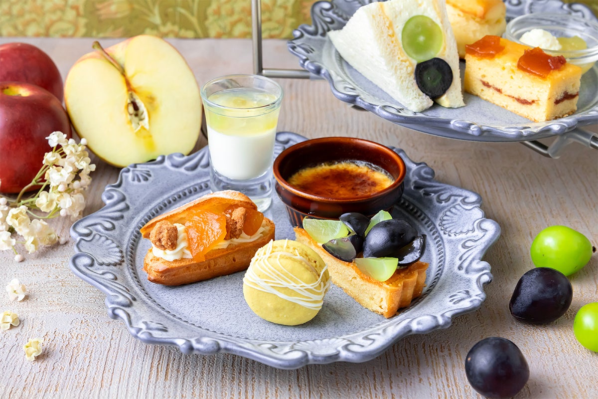 爽やかに秋の味覚を味わえるぶどうやりんごのプティガトーで彩られたアフタヌーンティー。TOOTH TOOTHの紅茶とともに、素敵なティータイムを。