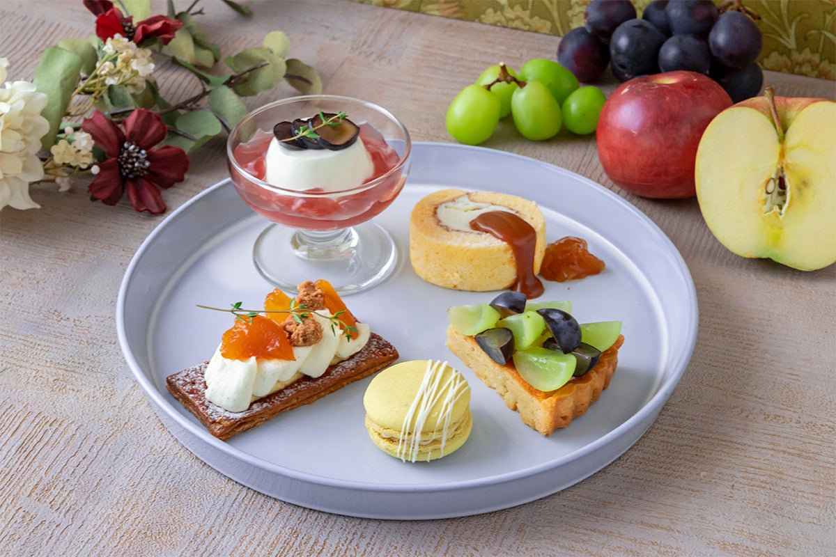 店内で焼き上げるサクサク食感のミルフィーユやPATISSERIE TOOTH TOOTH自慢のタルトなど、パティシエ特製のぶどうとりんごの様々なスイーツをお愉しみいただける一皿です。ゆったりと過ごす午後のティータイムに是非お愉しみください。