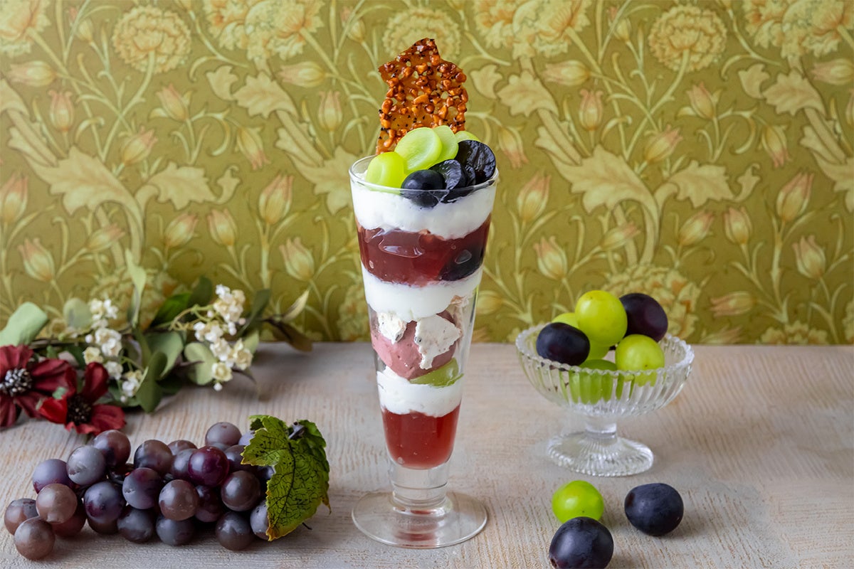 サングリアのジュレをベースに、すっきりとした甘みのクレームダンジュを。クランブルにメレンゲのサクサク感とともに、2種類のぶどうを贅沢にお愉しみいただける秋限定パルフェです。
