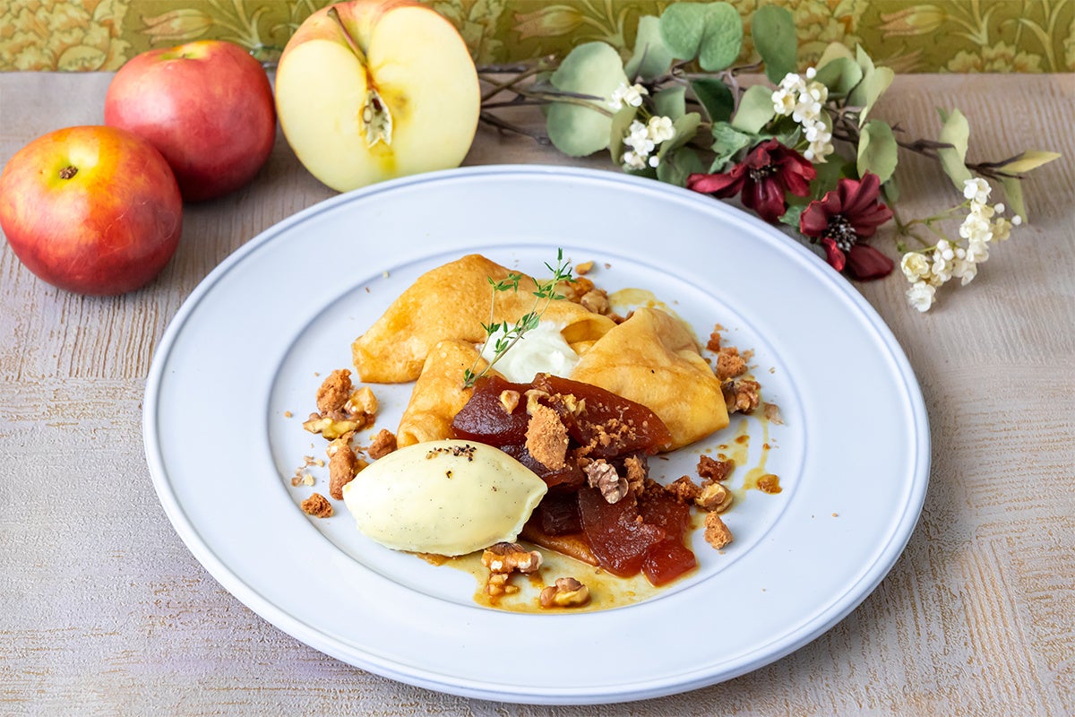 カルヴァドス香る温かいりんごのキャラメリゼに、サワークリームとバニラアイスを合わせました。クルミとシナモンクランブルのアクセントと共に、温度の変化と食感をお楽しみください。