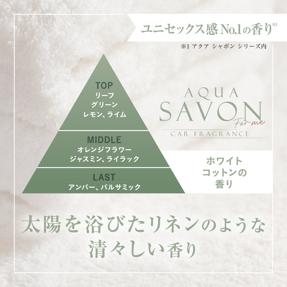 フレグランス、時計、ファッション雑貨等のブランドを取り扱う専門商社である株式会社ウエニ貿易(本社:東京都台東区、代表取締役社長:宮上光喜)は、 「わたしのための香り習慣。」をコンセプトに掲げる新ブランド「アクア シャボン フォーミー(https://aquasavon.jp/)」より、第一弾商品となるカーフレグランスシリーズを、2026年3月5日(木)より公式オンラインストアにて先行発売いたしました。本シリーズは、「わたしのための香り習慣。」をコンセプトに、香りをもっと気軽に、もっと日常に取り入れてほしいという想いから誕生。香水生まれの奥行きある香りと、車内の気になるニオイを抑える消臭機能(※1)を兼ね備えた、本格派カーフレグランスです。