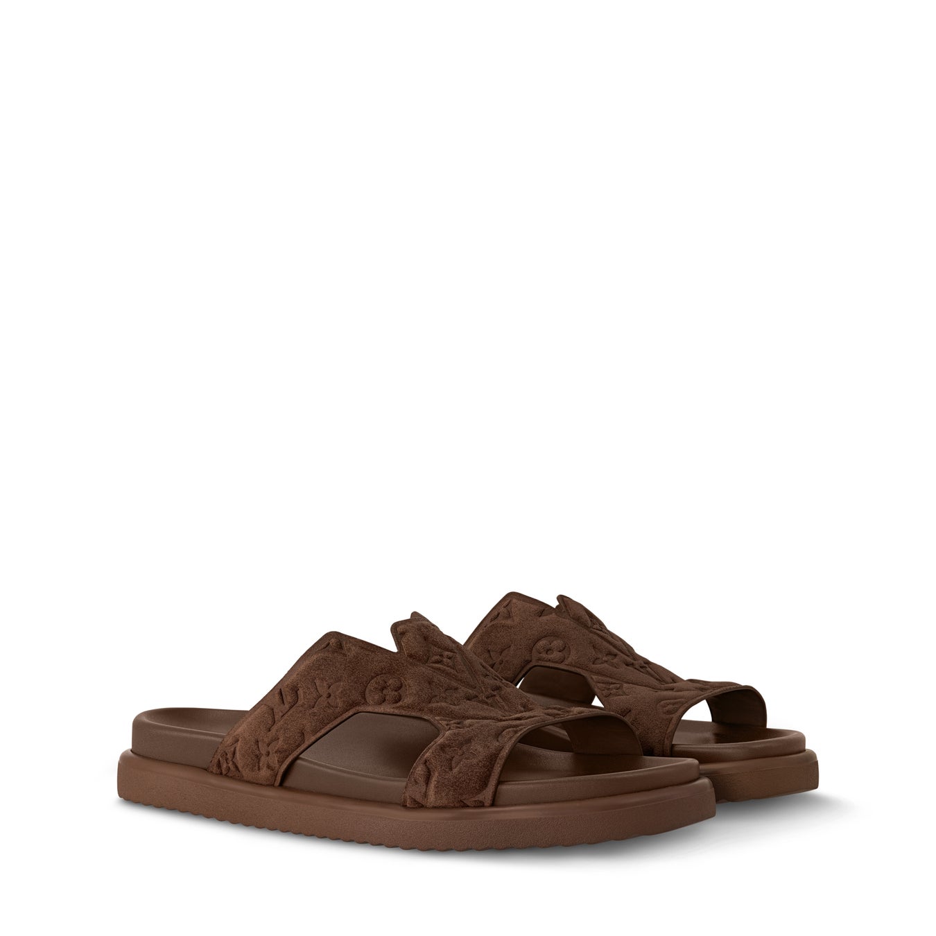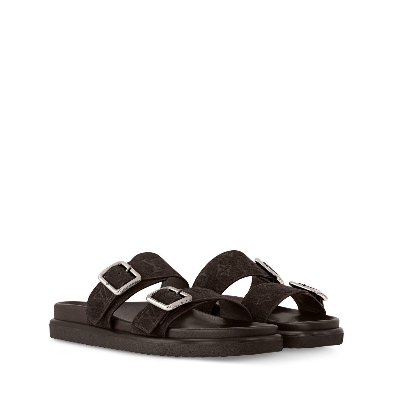 ベルベットのようなスエードレザーに、ルイ·ヴィトンのモノグラム·パターンをデボス加工で施した「LV ヴェニス ミュール」。ゴールドカラーの長方形のバックルをあしらった2本の調節可能なストラップが特徴です。パッド入りのアナトミックフットベッドと軽量のマイクロアウトソールで仕上げた、この上なく快適な履き心地の1足。