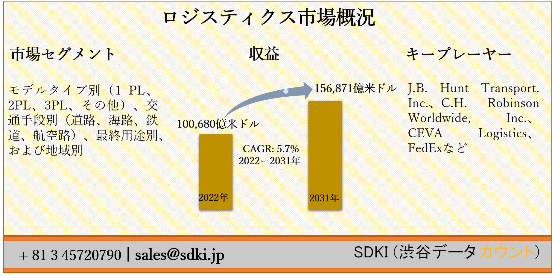 SDKI Inc.は、「グローバルロジスティクス市場ー予測2022ー2031年」新レポートを 2022年01月28日に発刊しました。この調査には、ロジスティクス市場の成長に必要な統計的および分析的アプローチが含まれています。レポートで提供される主要な産業の洞察は、市場の既存のシナリオに関する読者に市場の概要についてのより良いアイデアを提供します。さらに、レポートには、市場の成長に関連する現在および将来の市場動向に関する詳細な議論が含まれています。