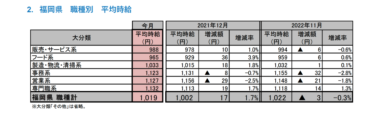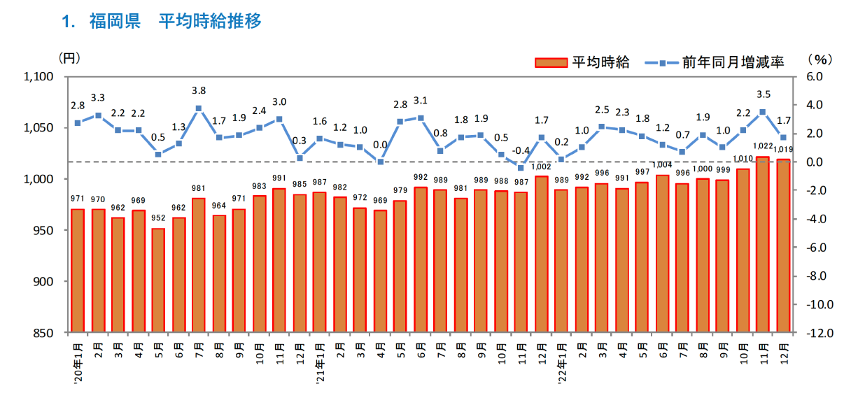 ■ 福岡県の平均時給は1,019円(前年同月1,002円、前月1,022円)