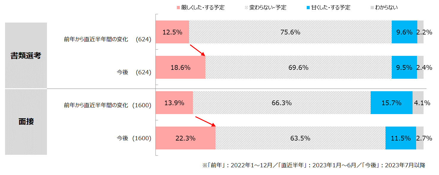 中途採用活動の課題としては「求職者の質が低い」が36.3%で最も高かった。今後の採用基準の変化について聞いたところ、「書類選考」「面接」ともに「厳しくする予定」が増加した。特に「面接」では「厳しくする予定」が8.4pt増加しており、自社にマッチする人材を厳しくチェックする意向で、質の高い応募者を求めて妥協しない姿勢を見せている。【図3、4】