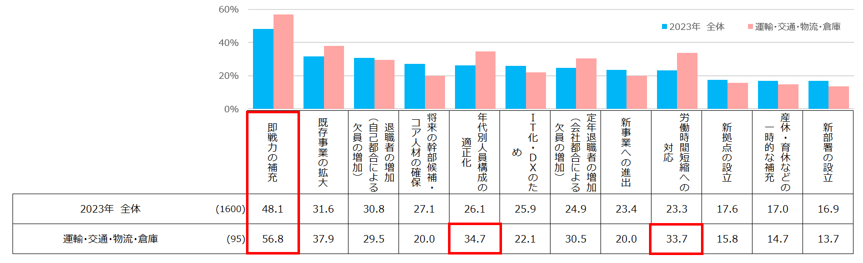 企業が中途採用を実施した理由は「即戦力の補充」が最多。「運輸・交通・物流・倉庫」業界では、「労働時間短縮への対応」が全体より10pt以上高く、2024年問題への対応が進む【図1、2】
