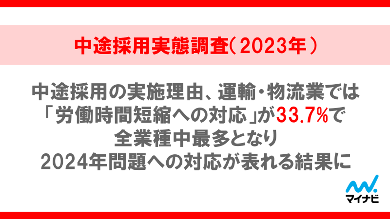 中途採用の実施理由、運輸・物流業では「労働時間短縮への対応」が33.7%で全業種中最多。「定年退職者の増加のため」も30.5%と高い