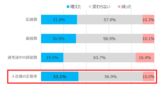 企業が求職者へ「リアルな仕事情報の事前提供」を行うRJP※について、意図的に行っているかを聞くと、約8割の企業が「意図的に行っている」と回答。RJP実施の効果については「入社後の定着率が増えた」が33.1%と最も高く、選考においてリアルな情報提供は、社員の定着に役立っているようだ。【図6、7】