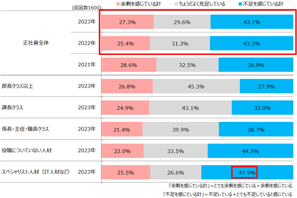 中途採用を行っている企業に、直近半年間(2023年1月~7月)の正社員の過不足感を聞くと、「余剰」が27.3%、「不足」が43.1%となった。前年と比べ「余剰」が+1.9ptとなっているが、「不足」はほぼ変わらず、不足感の解消は進んでいないことがわかる。役職やスキル別では特に「スペシャリスト人材(IT人材など)」が最も多く47.9%で専門人材が不足していることがうかがえる。