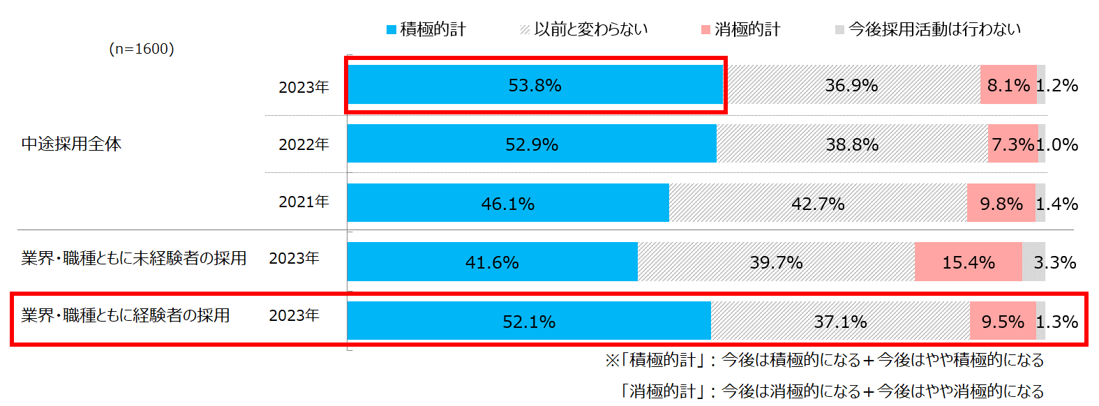 中途採用意向について、「積極的」は53.8%で、「消極的」を大きく上回った。特に経験者採用に積極的になるという回答が多い結果に【3、4、5】