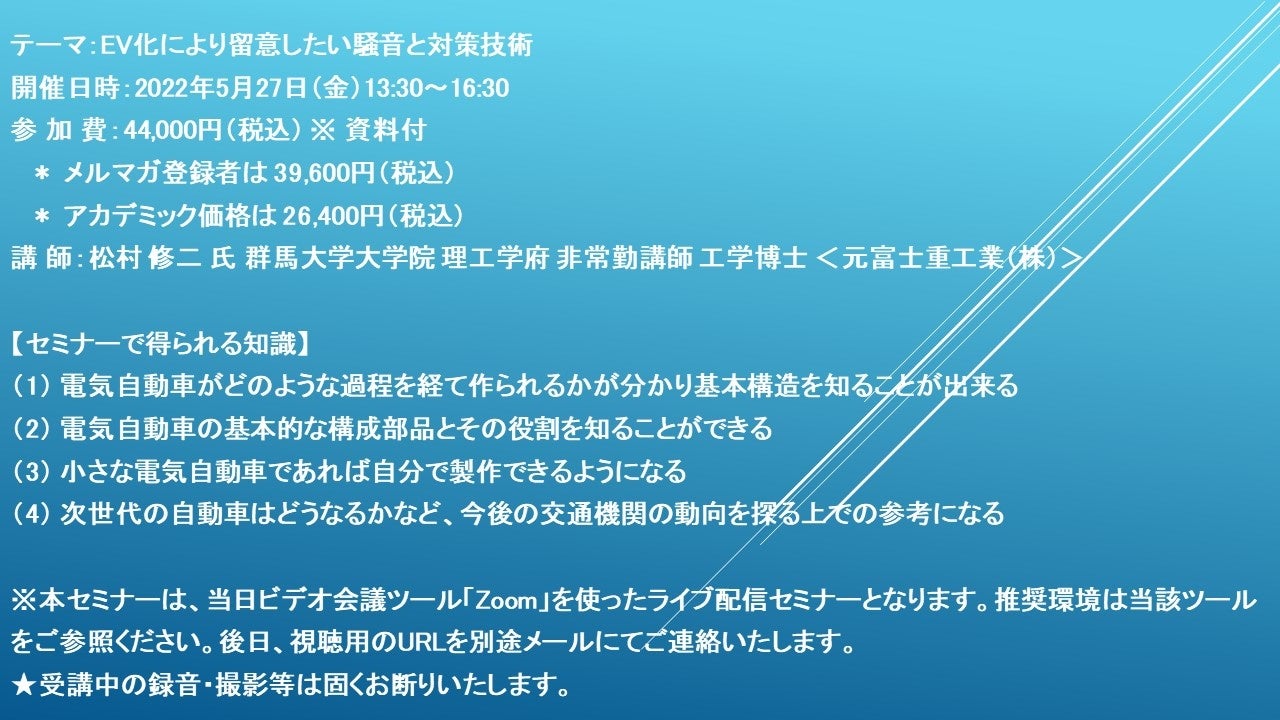 先端技術情報や市場情報を提供している(株)シーエムシー・リサーチ(千代田区神田錦町: https://cmcre.com/ )では、 各種材料・化学品などの市場動向・技術動向のセミナーや書籍発行を行っておりますが、 このたび「EV化により留意したい騒音と対策技術」と題するセミナーを、 講師に松村 修二 氏 群馬大学大学院 理工学府 非常勤講師 工学博士 <元富士重工業(株)>)をお迎えし、2022年5月27日(金)13:30より、 ZOOMを利用したライブ配信で開催いたします。 受講料は、 一般:44,000円(税込)、 弊社メルマガ会員:39,600円(税込)、 アカデミック価格は26,400円(税込)となっております(資料付)。