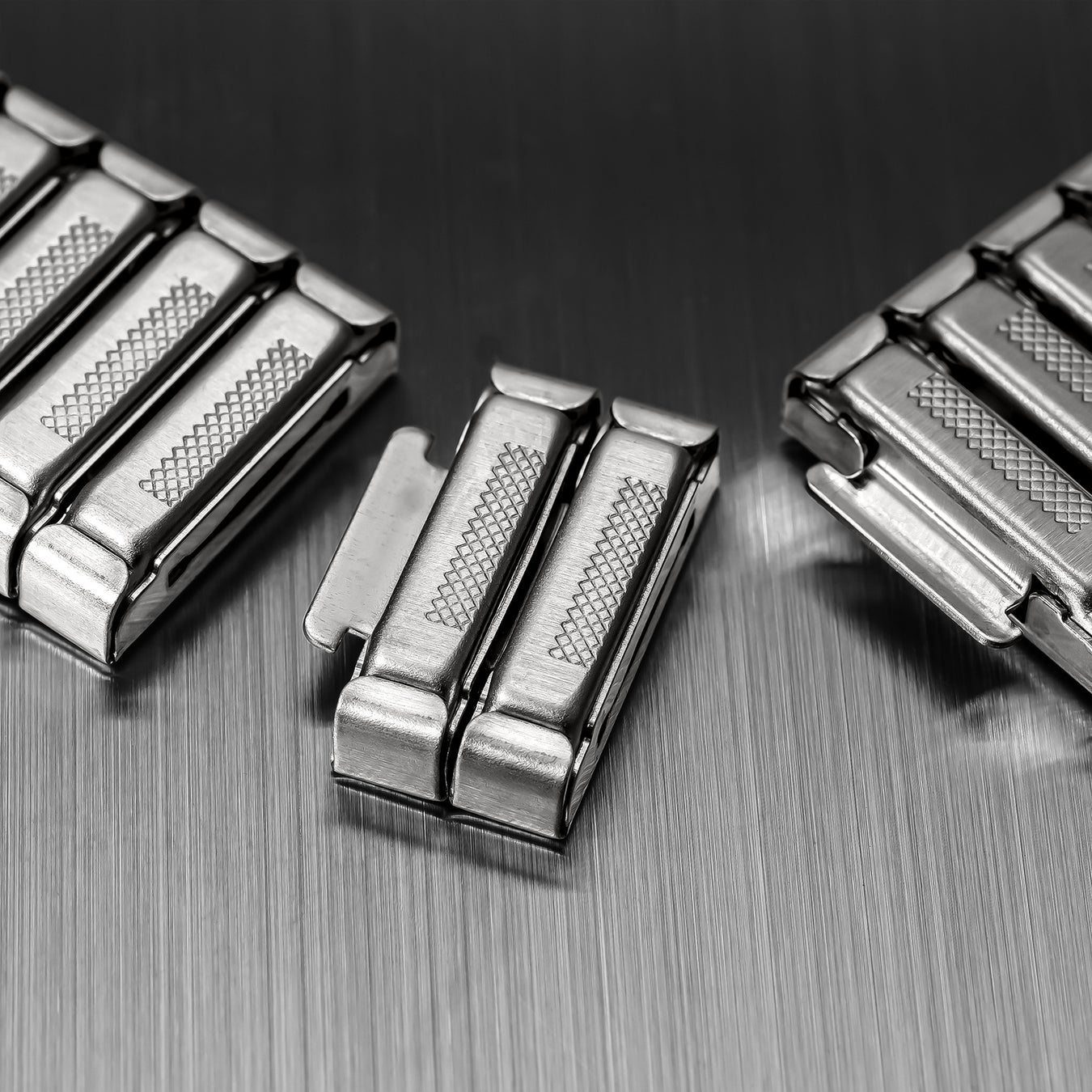 ケースからベルトの中央につながる部分はヘアライン加工を施すことで一体感を。またベルトの両サイドはポリッシュ加工と使い分け。絶妙なコントラストを醸すのはもちろん、両サイドを鏡面仕上げにすることで、引き締まった印象を与えてくれる。