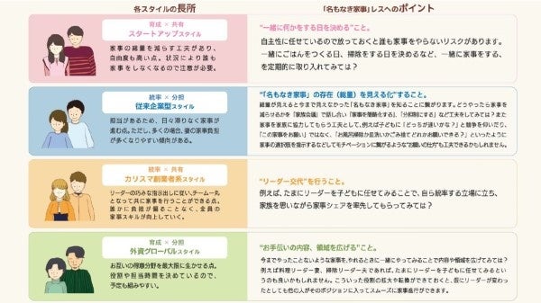 各「家事マネスタイル」の長所と「名もなき家事」レスを実現するためのポイントをまとめたのが下の図になります。是非参考にしてみてください。