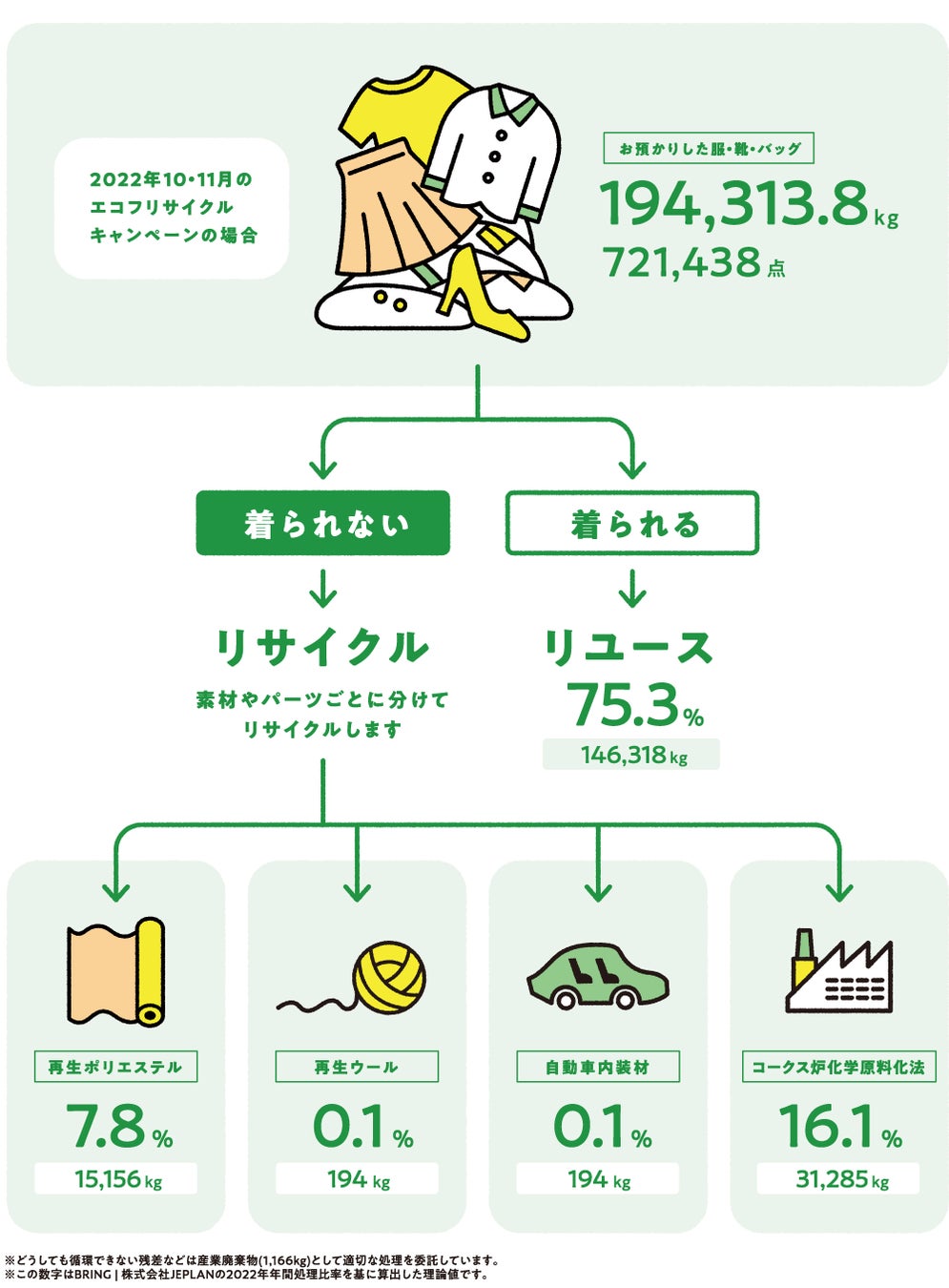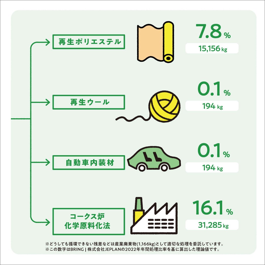 再生ポリエステル・再生ウール・自動車内装材にリサイクルされたり、コークス炉化学原料化法でリサイクルされ生まれ変わります。
