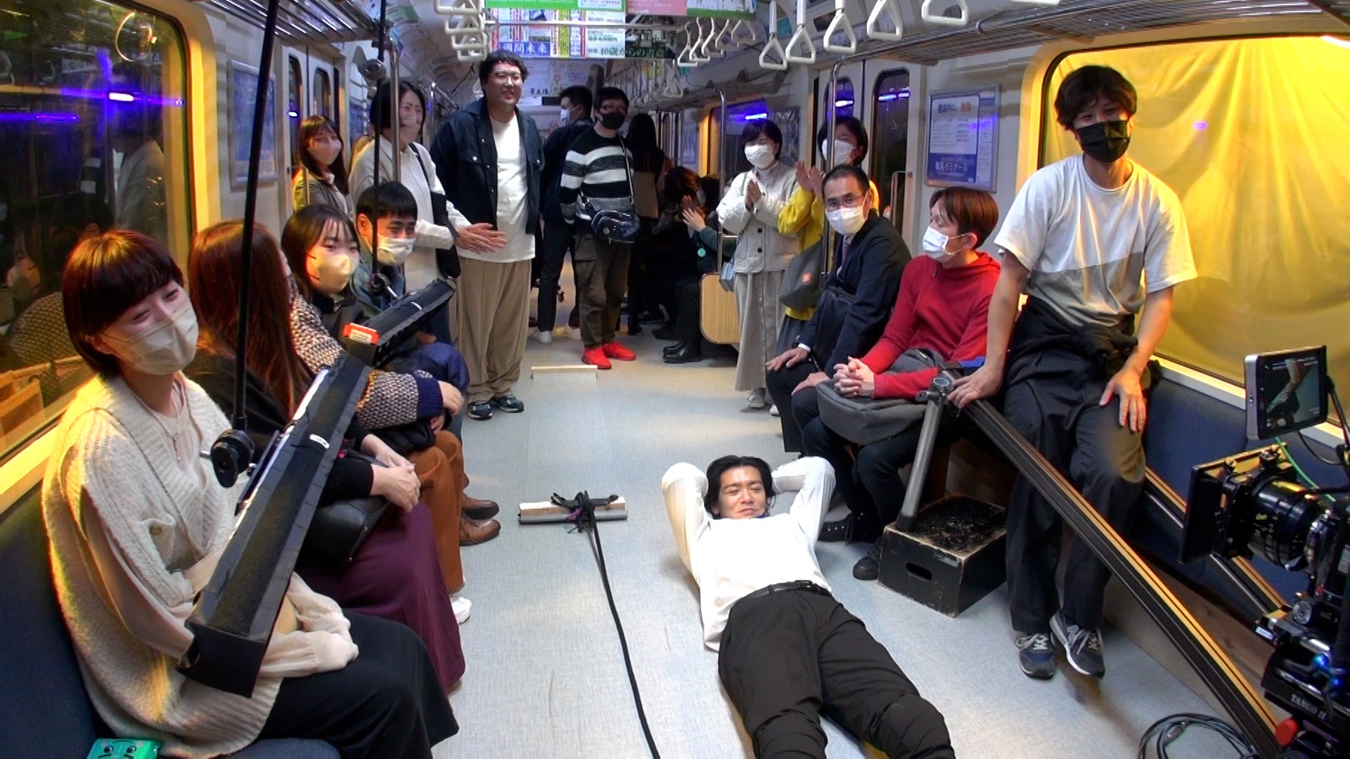撮影は和やかなムードで順調であったものの、大きな揺れと共に小銭が飛び交う電車内で、野田クリスタルとバイク川崎バイク、エキストラの乗客が崩れ落ちるシーンは、全てのタイミングを合わせる難易度が高いもので20テイクも撮り直すことに。