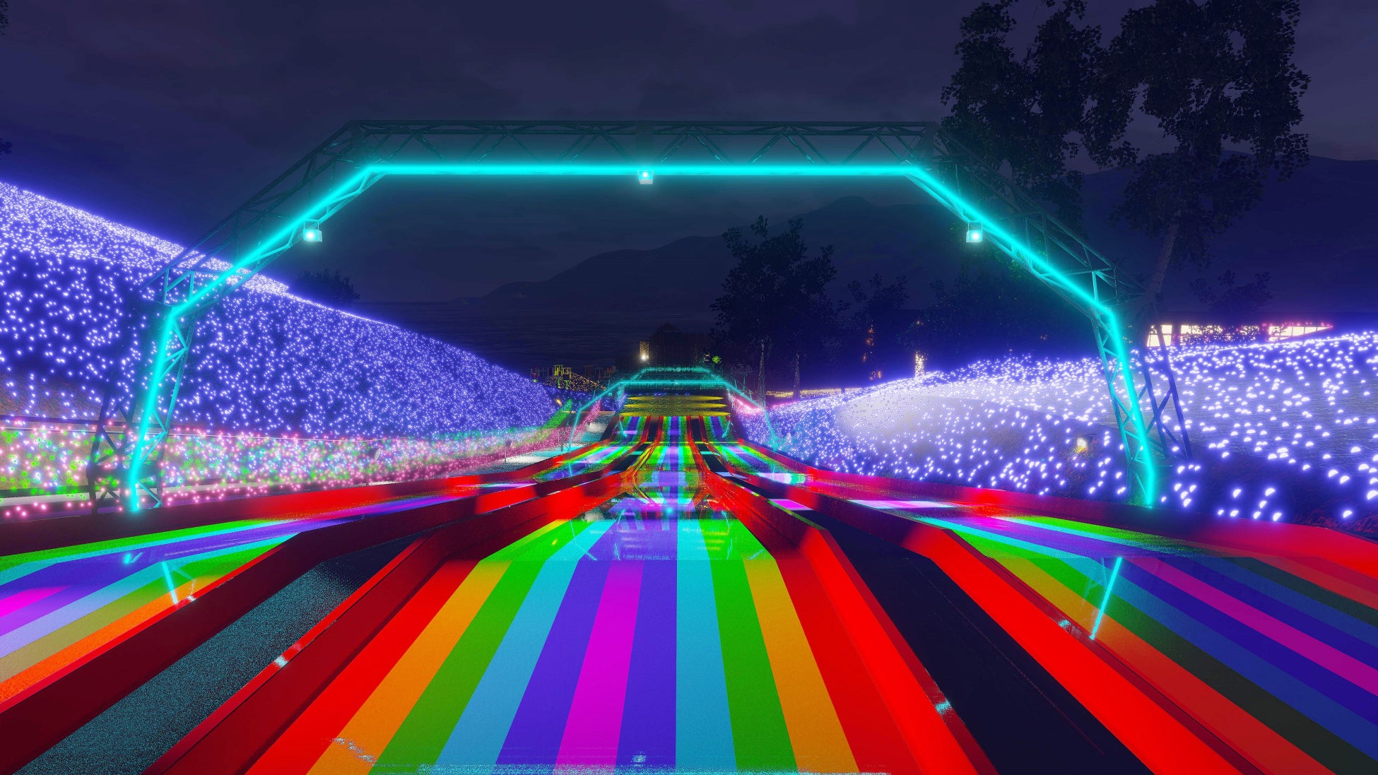 また、本年オープンした全長100mのスライダー「マジカルウェーブ」と、標高370mの空中を自転車で漕ぎ進む「青空ペダル」が、ナイトアトラクションとして登場します。人気の、虹色の光に包まれながら空中散歩を楽しめる「虹のリフト」とあわせて、「三大体験型イルミネーション」としてお楽しみいただけます。