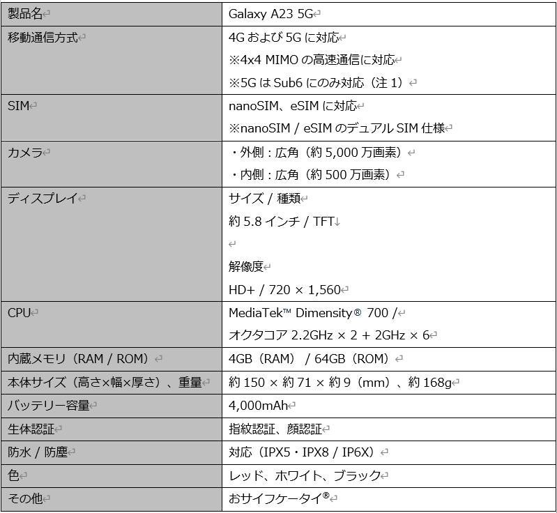 このほか、防水(IPX5・IPX8)・防塵(IP6X)(注4)、指紋・顔による生体認証、お子様のご利用に最適な「端末リモート追跡」機能(注5)、おサイフケータイ®のほか、nanoSIMとeSIMのデュアルSIMにも対応するなど、便利な機能を多数搭載しています。