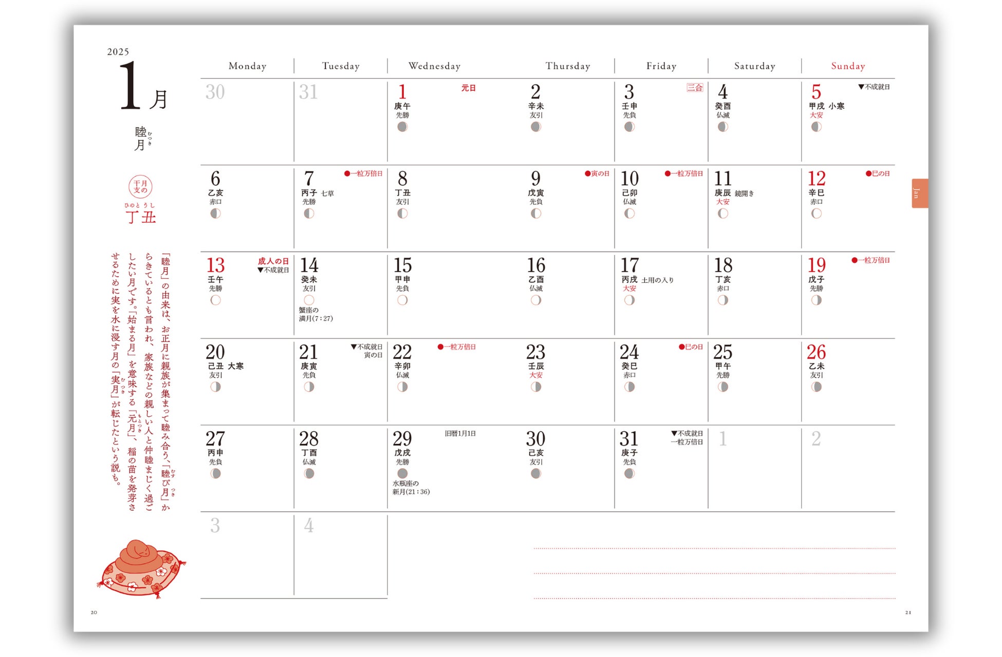 佳き日に重要な行動を起こす、季節の節目に気持ちを新たにするなど、古来日本人は日取りや季節の分かれ目を大切にしてきました。和暦に基づいたカレンダーは、「縁起のいい日取り」を考えるのに便利な仕立てになっています。