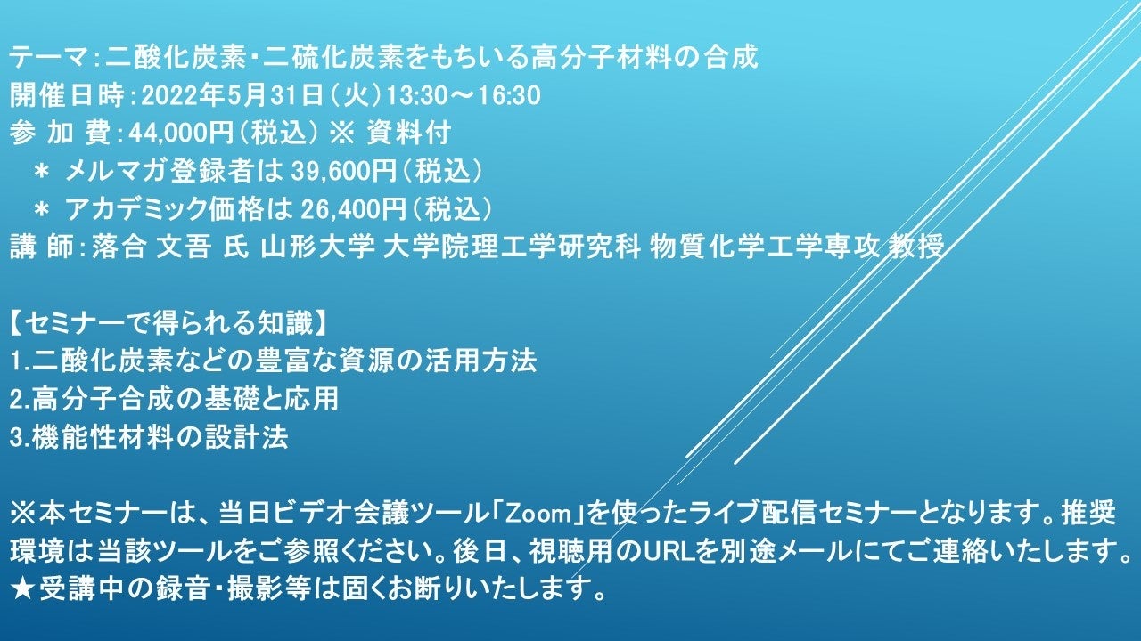 先端技術情報や市場情報を提供している(株)シーエムシー・リサーチ(千代田区神田錦町: https://cmcre.com/ )では、 各種材料・化学品などの市場動向・技術動向のセミナーや書籍発行を行っておりますが、 このたび「二酸化炭素・二硫化炭素をもちいる高分子材料の合成」と題するセミナーを、 講師に落合 文吾 氏 山形大学 大学院理工学研究科 物質化学工学専攻 教授)をお迎えし、2022年5月31日(火)13:30より、 ZOOMを利用したライブ配信で開催いたします。 受講料は、 一般:44,000円(税込)、 弊社メルマガ会員:39,600円(税込)、 アカデミック価格は26,400円(税込)となっております(資料付)。