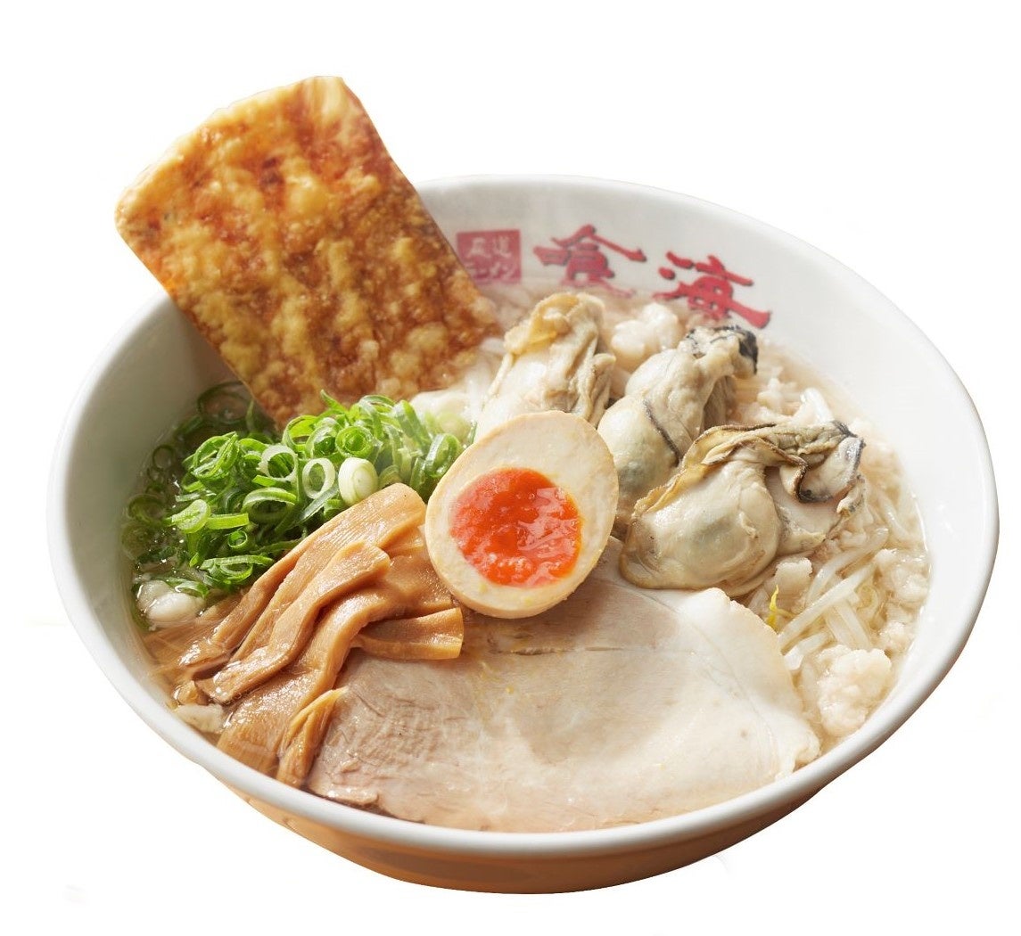 瀬戸内の小魚から煮出した魚系スープと、鶏ガラ・野菜などから煮出したスープのダブルスープ。あっさりしながらコク深い塩ラーメンに大判いか天と広島産カキをトッピングしました。