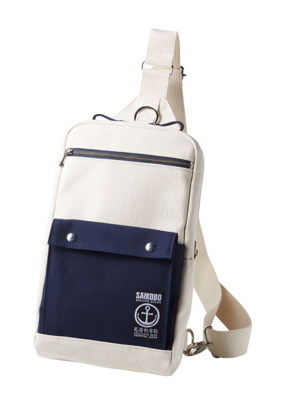 国産帆布を使い鞄や小物を手作りしている広島・尾道の帆布工房。爽やかなマリンカラーの帆布ボディバッグはポケットも多く、機能的です。