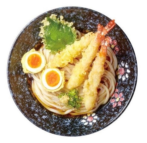 昭和5年から麺づくり一筋の製麺所がつくる、ゆでたてプリプリの讃岐うどん。濃いめのつゆをぶっかけたうどんにえび天と玉子天をのせました。