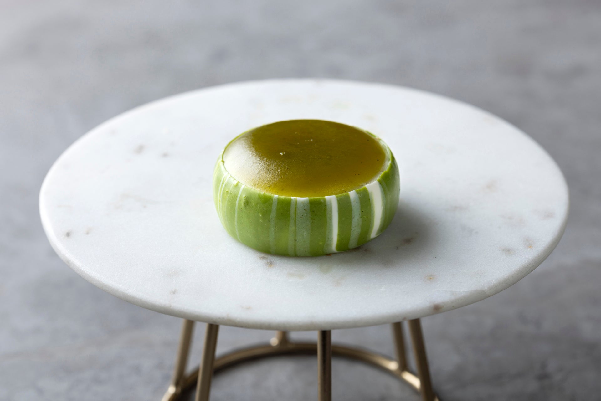 煎茶のジュレをまとった爽やかなムース。抹茶のアーモンド生地にライチの果肉とムースを重ね、湯呑を模した器に仕立てました。