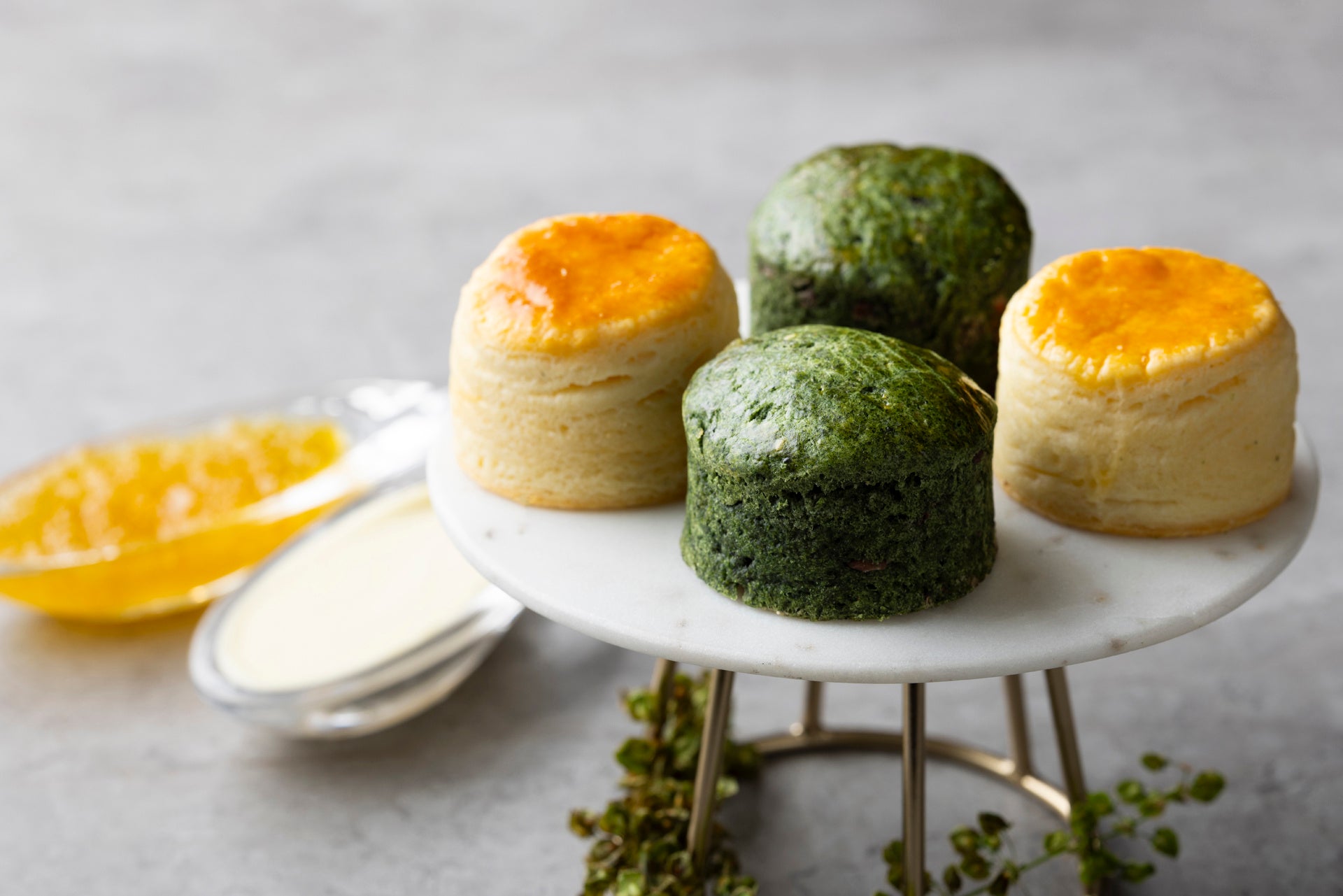 よもぎの香りと小豆の優しい甘みが広がる和テイストのスコーンと、発酵バターが香るクラシックなプレーンスコーンをご用意。お好みのティーとともに、しっとりとした焼き立ての味わいをご堪能ください。