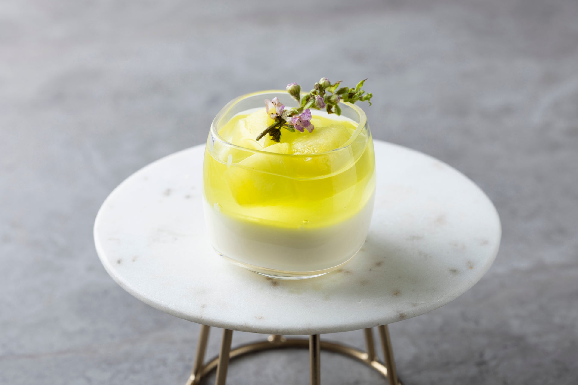 みずみずしいメロンの果肉を贅沢に散りばめ、メロン風味のパンナコッタと爽やかなレモンジュレを重ねた初夏らしい清涼感あふれるグラススイーツです。