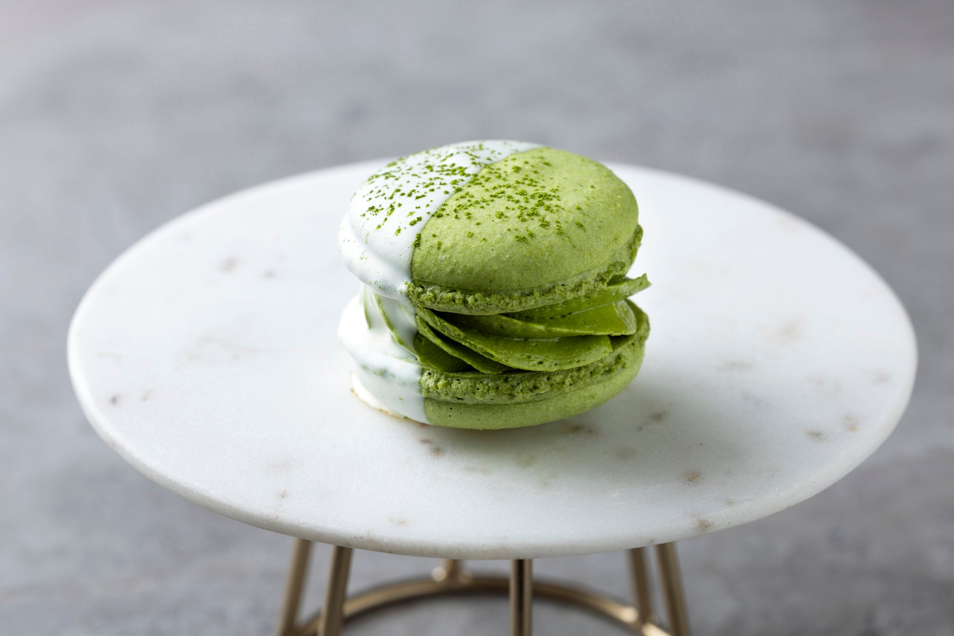 抹茶を練り込んだマカロン生地に、軽やかなバタークリームと抹茶の風味を重ね、ホワイトチョコレートでコーティングしたコク深い逸品です。