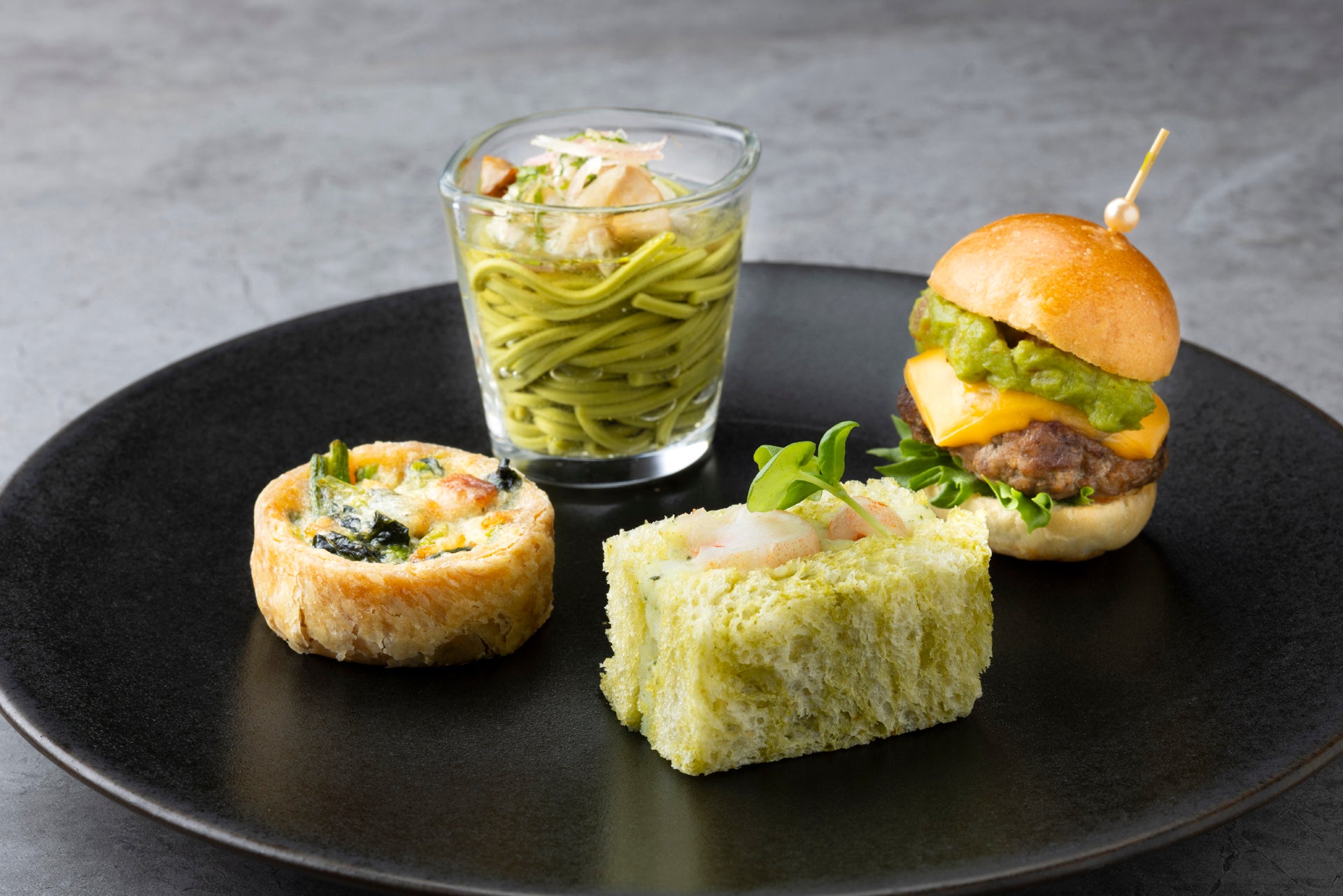 ホウレン草の旨みを閉じ込めたキッシュ、茶そばにホタテとエリンギを添えた風味豊かな一皿、抹茶パンでサンドした海老とジャガイモのバジル風味サンドウィッチ、ピリ辛のワカモレを挟んだミニハンバーガーをご用意。和と洋の多彩な味わいが、ティータイムに奥行きを添えます。