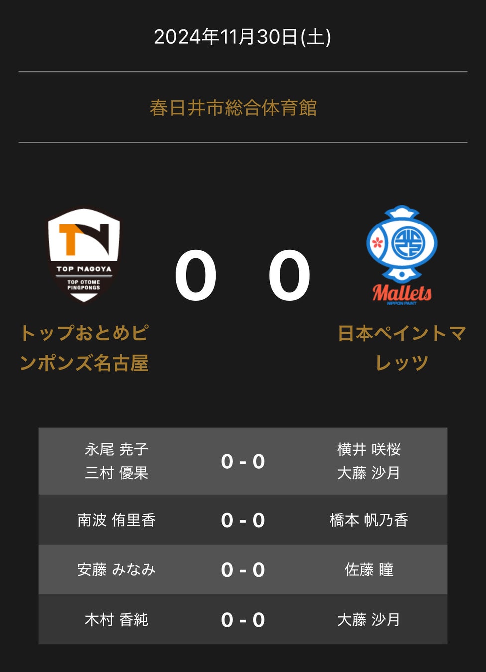 ノジマTリーグ 2024-2025シーズン 公式戦 11月30日開催 トップおとめピンポンズ名古屋 vs日本ペイントマレッツ 対戦オーダー発表