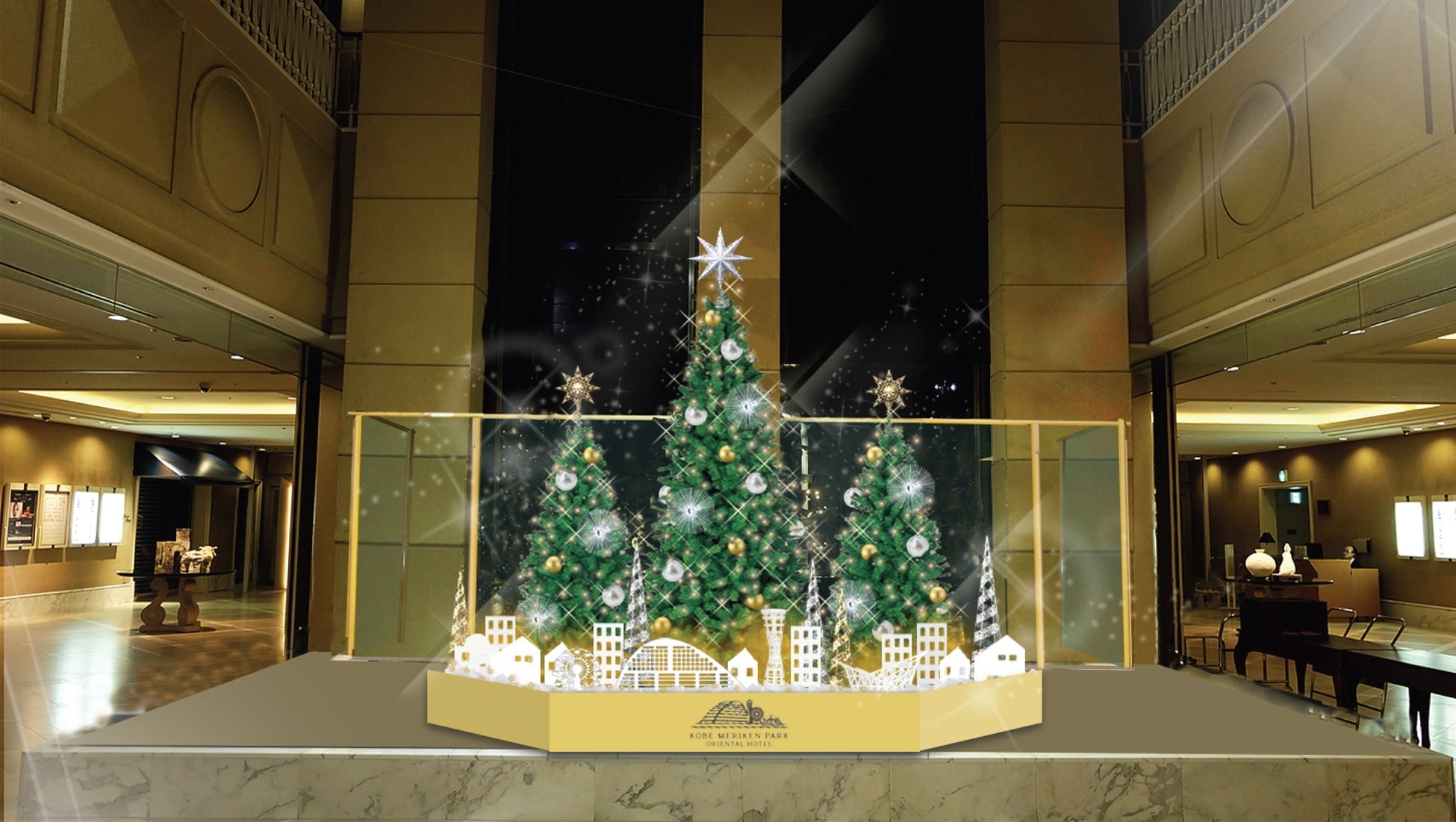 2025年11月1日(土)より、ホテルロビーでクリスマスのディスプレイを展示します。きらめく港と街のイルミネーションが織りなす「神戸1000万ドルの夜景」をテーマに、飛行機から見える神戸の街の輝きや、旅の期待に胸が膨らむゲストのときめきに思いを馳せました。