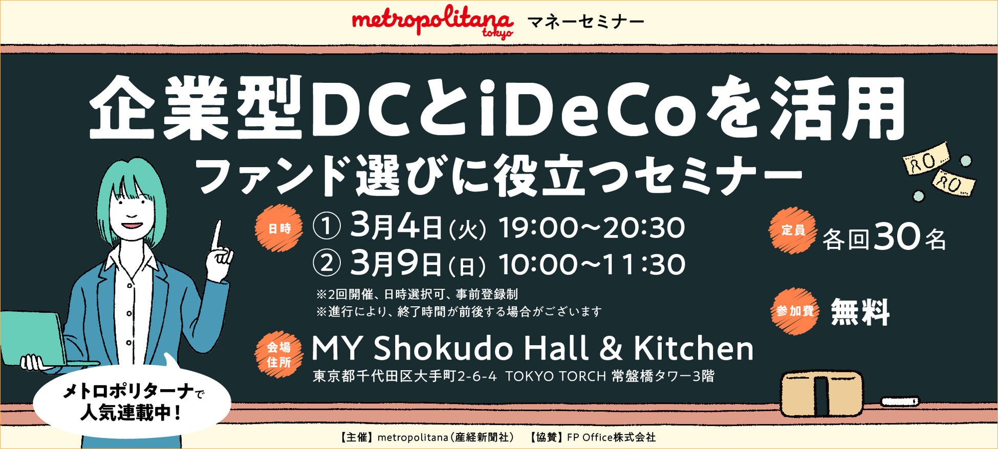 メトロポリターナ(産経新聞社発行)は、資産運用などに興味がある人を対象に「企業型DCとiDeCoを活用 ファンド選びに役立つセミナー」を東京都千代田区のカフェラウンジ「MY Shokudo Hall & Kitchen」で3月4日(火)午後7時、同9日(日)午前10時からそれぞれ開催し、参加者を募集します。