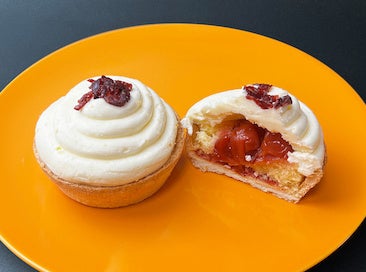 北海道産発酵バターで作ったバタークリームをたっぷりとのせたモンブラン。サクサクのパイ生地タルトにラズベリージャムを敷いてスポンジ、サワーチェリー、バタークリーム、クランベリーのドライフルーツを順にのせました。バタークリームやスポンジ、タルトの甘みと、ベリーやチェリーの酸味がマッチしています。