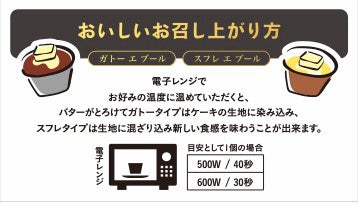 *電子レンジでお好みの温度に温めていただくと、バターがとろけてガトータイプは生地に染み込み、スフレタイプは生地に混ざりこみ新しい食感を味わうことができます。