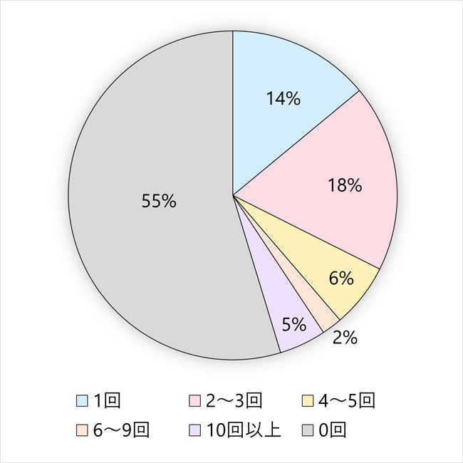 ここ1年以内で、大人数宴会に一度も参加しなかった人は過半数の55%を占め、飲み会に消極的な人が一定数いることが明らかに。コロナ禍の影響やリモートワークの普及により、大勢での集まりを避けるようになったことが考えられる。一方で、1回以上参加した人は合計で45%存在。その中には、10回以上も参加した“飲み会Lover”も。対面での交流を好んで、積極的に大人数の会食に参加していると推測。全体として、大人数宴会に対する参加姿勢は二極化していると言えそう。