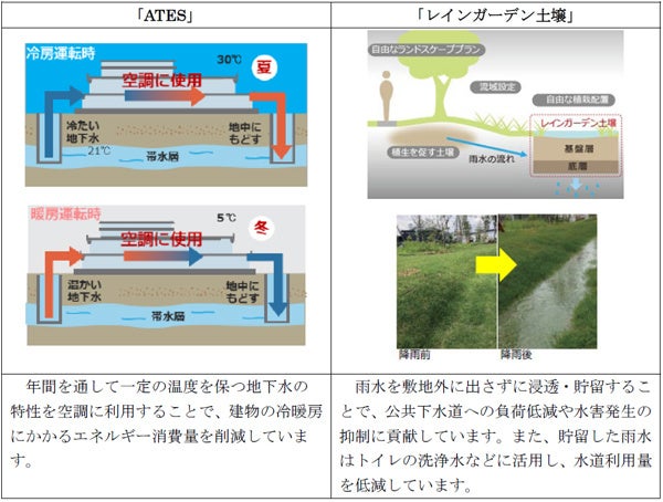 本施設では、エネルギー使用量削減や雨水による環境負荷低減のために、地下水を利用した蓄熱システム「ATES」や、フジタが開発した浸透率を9倍、保水率を2倍まで高める「レインガーデン土壌」(※6)など最先端技術を搭載しています。
