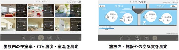 当施設では、施設利用者の快適性向上や業務効率化を目的に、ビル管理システム「BEMS」を導入しました。施設内外の空気質や施設内の在室率・CO2濃度・室温などのデータを10分ごとに可視化し、利用者の執務場所選択や、管理者の空調調整などの効率化につなげています。