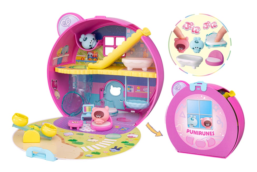 “ぷにぷに”触感の“あいるん”と“ともるん”のフィギュアや家具がセットになったおうちです。おうちを閉じると液晶トイ「ぷにるんず ぷにともつーしん」そっくりの形をしており、ゲーム内のお世話遊びを実際に楽しめます。