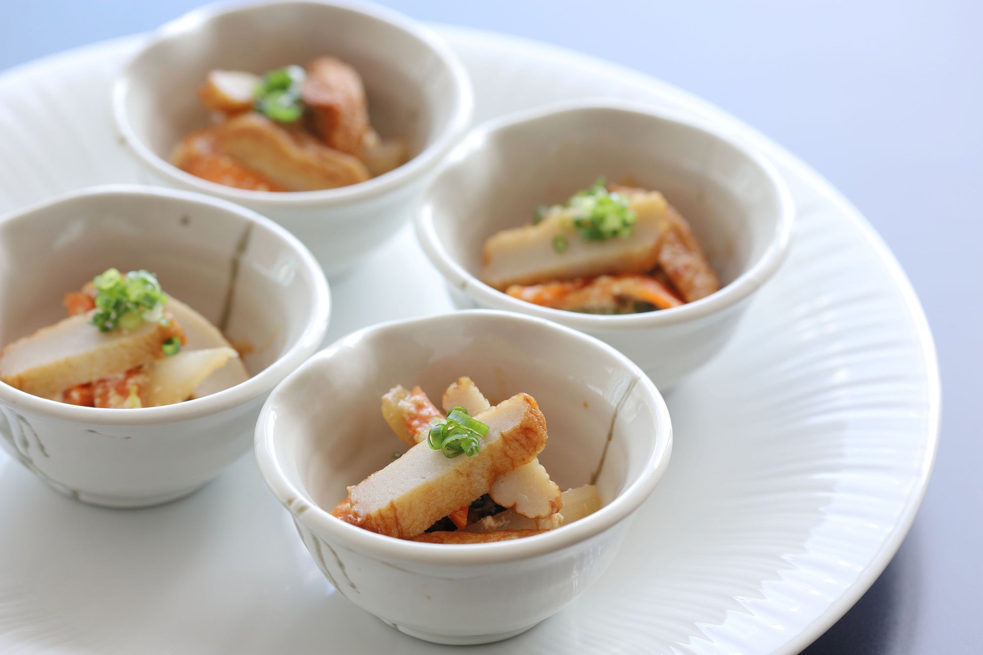 地元の食卓に欠かせないさつま揚げ。子どものおやつや晩酌のつまみ、家族団らんの夕食と、鹿児島の暮らしに深く根づいた味わいです。馴染み深いさつま揚げに地元野菜を添えた、郷土色豊かな一品です。