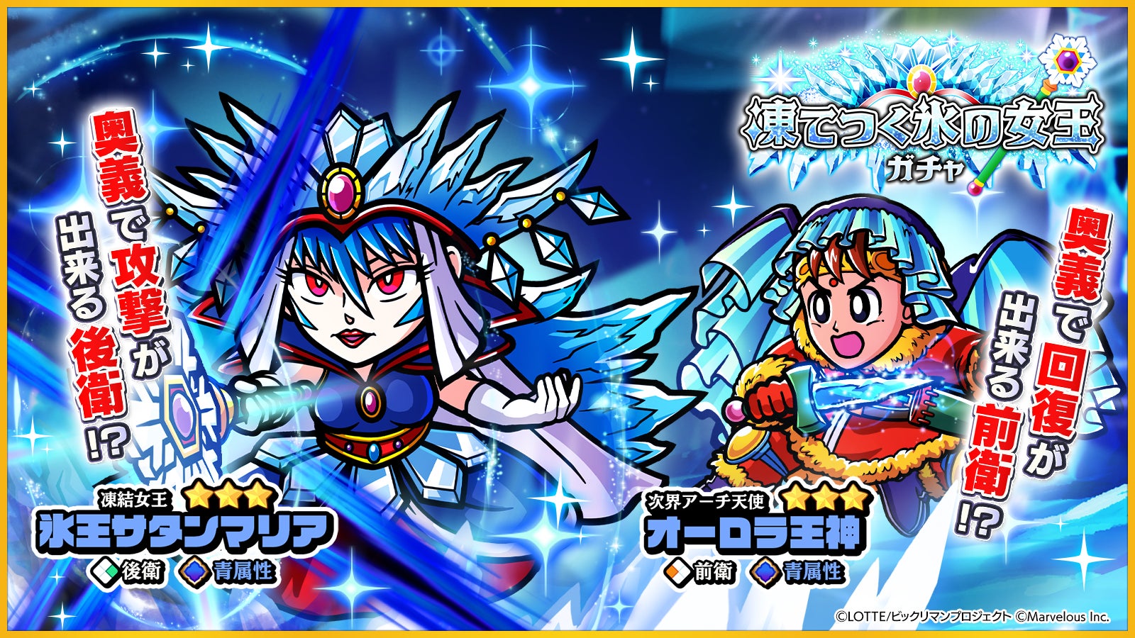 新たな☆3キャラクター[凍結女王]氷王サタンマリア、[次界アーチ天使]オーロラ王神が登場する「凍てつく氷の女王ガチャ」を開始いたしました。
