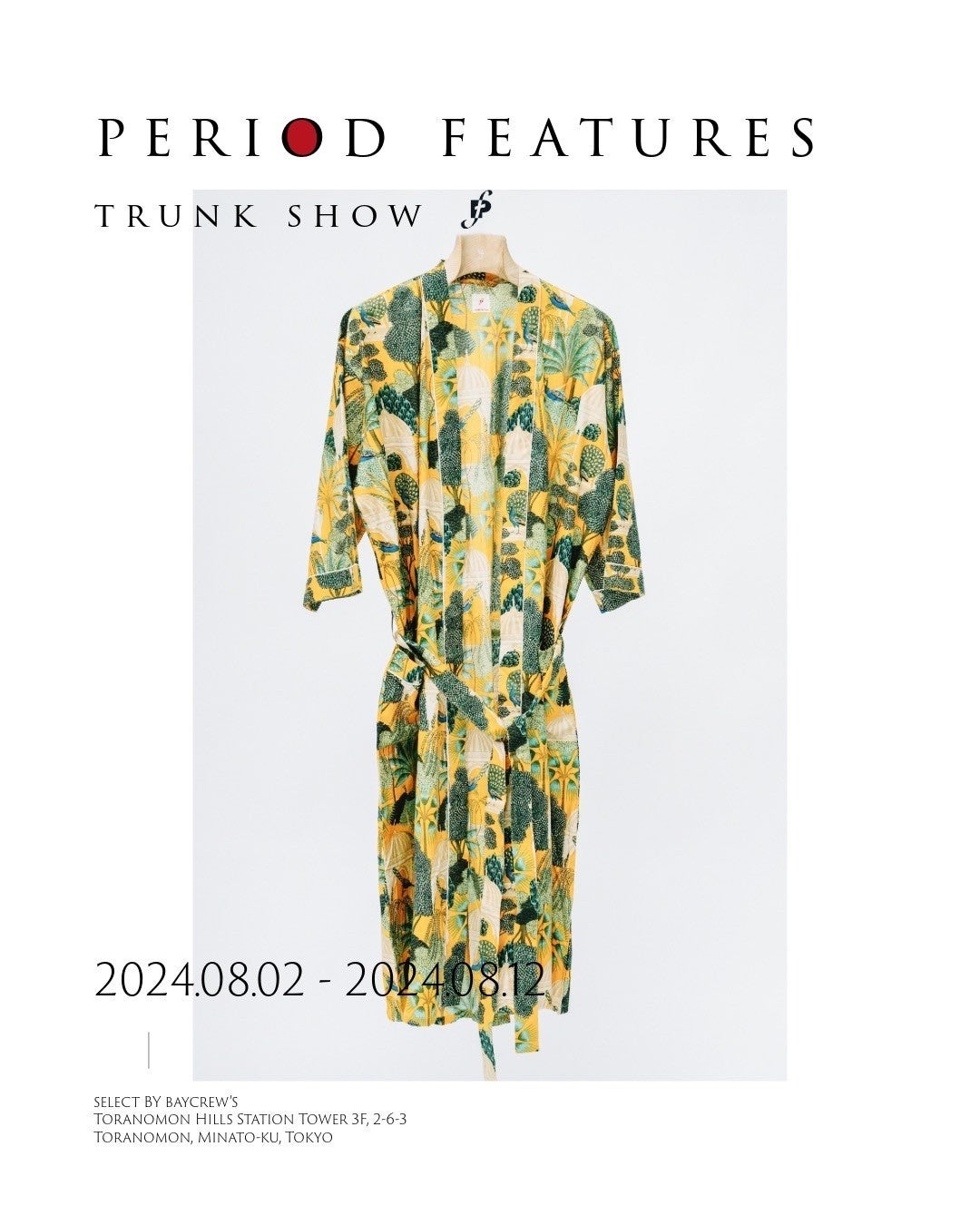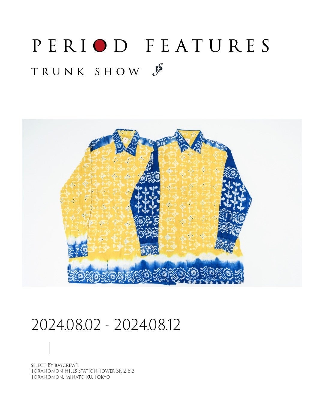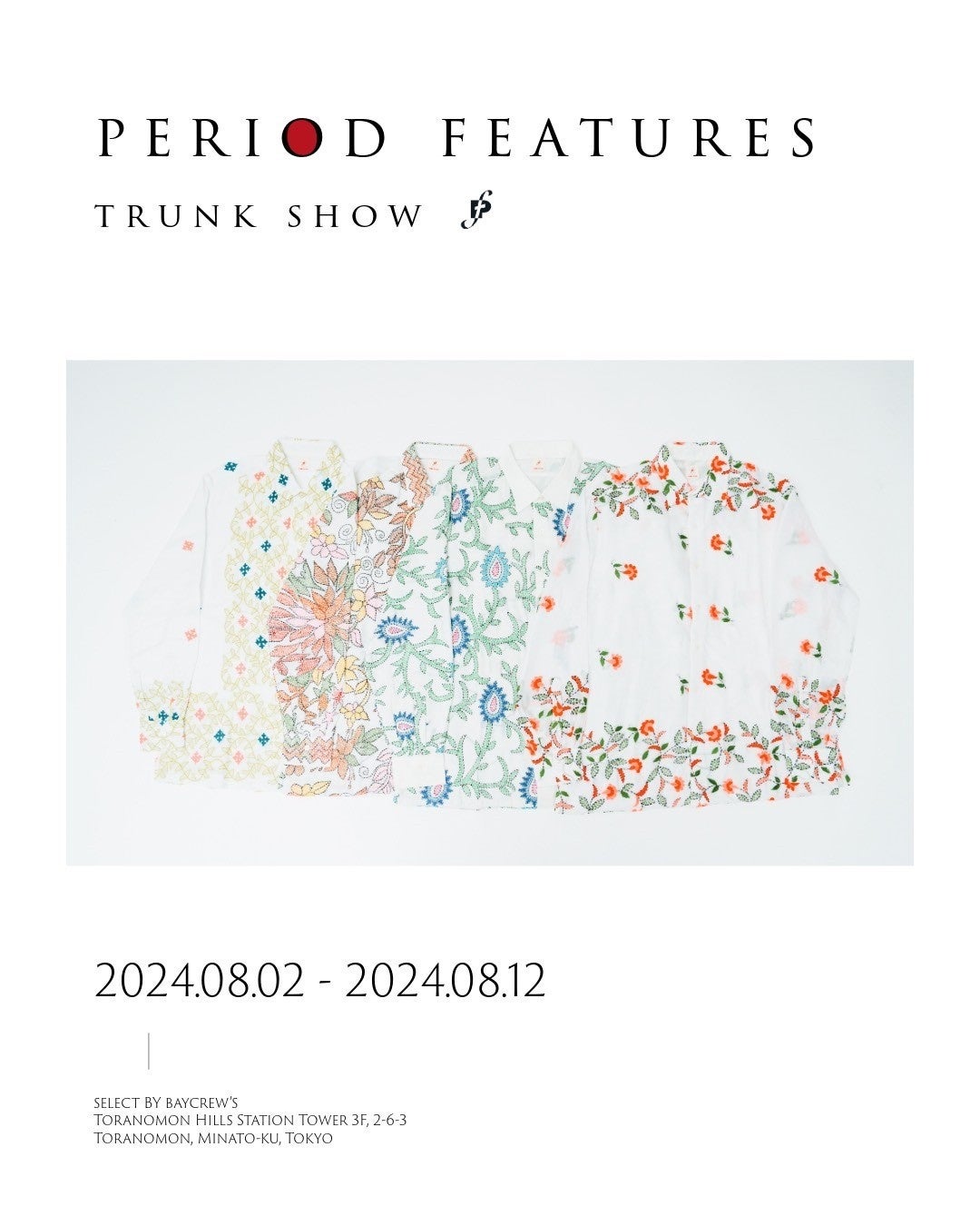 レショップでも毎シーズン賑わいを見せるPERIOD FEATURESのトランクショーを虎ノ門ヒルズステーションタワーに新たにオープンしたSELECT by BAYCREW'Sにて出張開催。新たに納品された美しい刺繍が施された一点物のシャツ数十点をはじめとして、男女問わず着用することができる洋服や小物など、過去最大級のボリュームで展開します。
